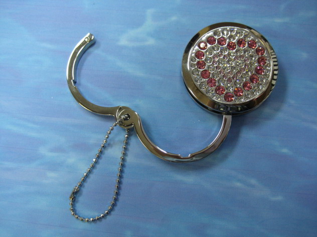 Round handbag hanger with crystal and back side with mirror in rhodium plated